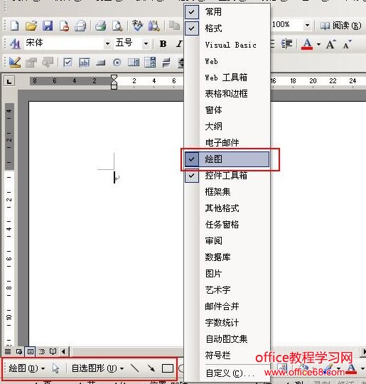 鼠标右键单击“菜单栏”,在弹出的下拉菜单中将“绘图”勾选即可。