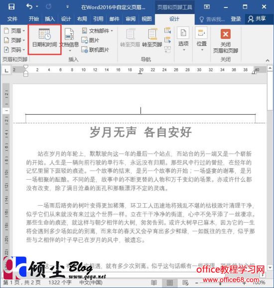 2.点完“页眉编辑”之后页眉已经跳转到“设计”选项卡中,这里点“日期和时间”按钮。如下图