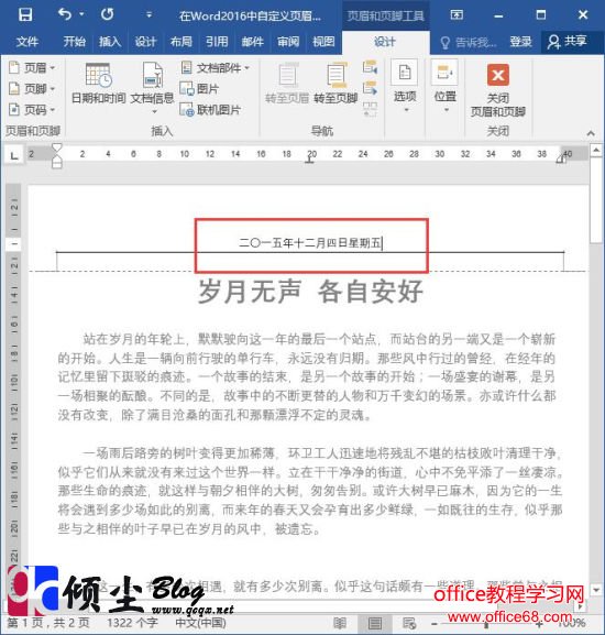 4.添加完成日期和时间之后如下图显示。如下图。这里我们还可以个页眉添加“作者”“标题”等