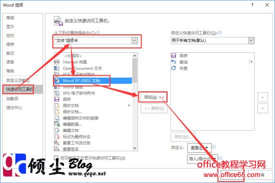 2.在弹出的“word选项”对话框中你在“快速访问工具栏”–“文件”选项卡–“Word97-2003文档”–添加–确定。如下图