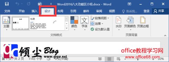 【设计】【设计】功能包括“文档格式”和“页面背景”两个分组,主要功能包括主题的选择和设置、设置水印、设置页面颜色和页面边框等项目。如下图