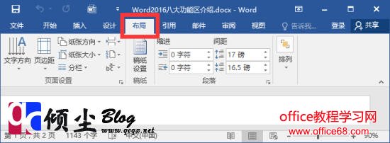 【布局】【布局】功能包括页面设置、稿纸、段落、排列几个组,对应Word2003的“页面设置”菜单命令和“段落”菜单中的部分命令,用于帮助用户设置Word2016文档页面样式。如下图
