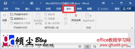【邮件】【邮件】功能包括创建、开始邮件合并、编写和插入域、预览结果和完成几个组,该功能区的作用比较专一,专门用于在Word2016文档中进行邮件合并方面的操作。如下图