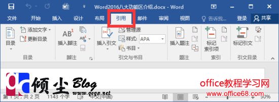 【引用】【引用】功能包括目录、脚注、引文与书目、题注、索引和引文目录几个组,用于实现在Word2016文档中插入目录等比较高级的功能。如下图