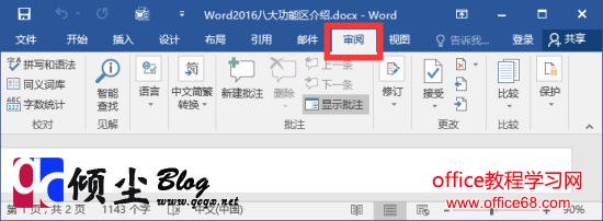 【审阅】【审阅】功能包括校对、语言、中文简繁转换、批注、修订、更改、比较和保护几个组,主要用于对Word2016文档进行校对和修订等操作,适用于多人协作处理Word2016长文档。如下图