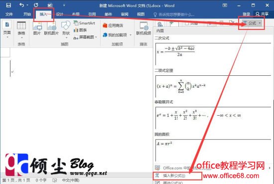 Word 2016自带的公式编辑器很强大,我们已经不需要在去安装MathType数学公式编辑器等查看了。下面说下在Word2016中插入数学公式的方法 如何插入一个公式在菜单栏的“插入”选项卡中点击“公式”按钮,在弹出的下拉菜单中可以选择“内置公式”也可以点击下方的“插入新公式”。如下图