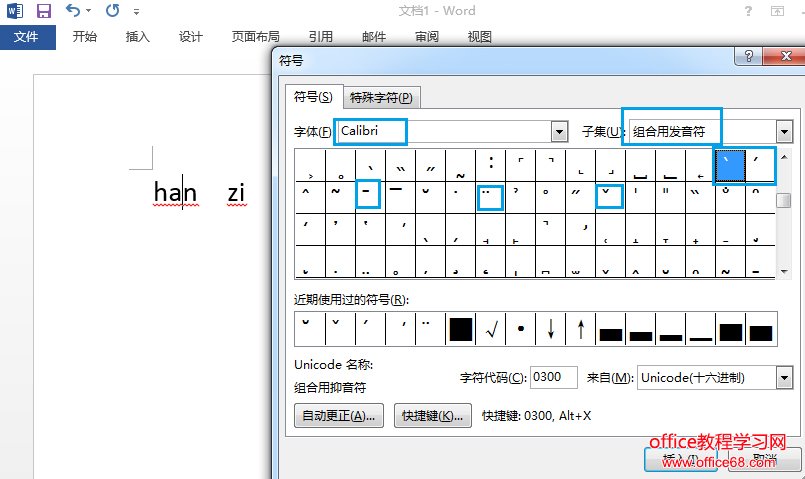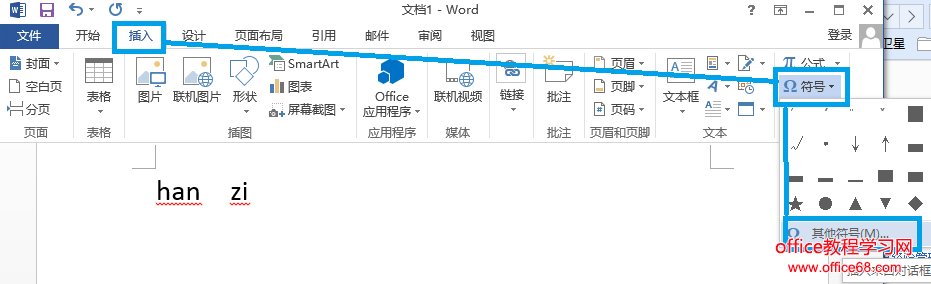 小朋友们的语文试卷是老师发的,自己手工输入后,需要标汉字的音调,word中如何实现呢?这个方面以前没有遇到,经过尝试,终于实现了。 以word2013为例(word2007或word2010比较类似吧),首先输入需要输入拼音,如 han zi ,然后将光标定位到需要标声调的字母的后边,然后点击“插入”“其他符号”。
