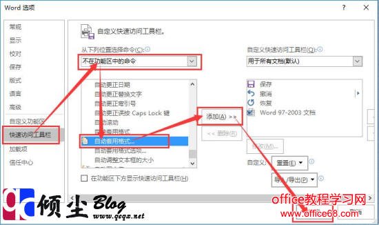 1.打开Word2016,点击左上角的【文件】-【选项】会打开“Word选项”对话框,在左侧选择“快速访问工具栏”,然后在右侧“从下来位置选择命令”选择“不在功能区中的命令”,在里面找到“自动套用格式…”项之后点击“添加”按钮,完成之后点“确定”如下图