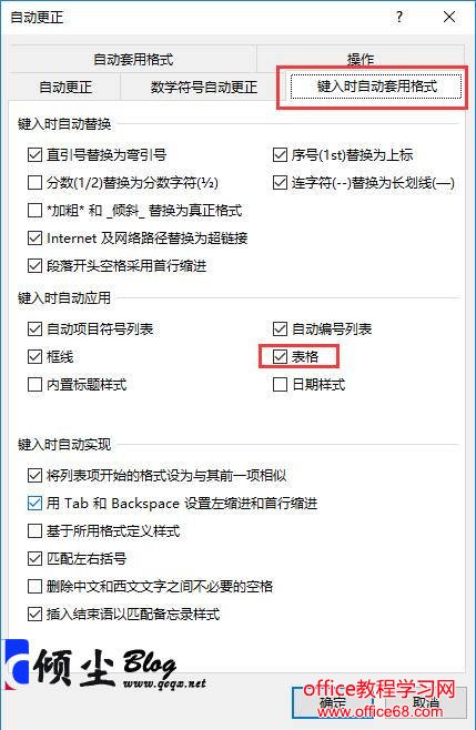 3.之后打开“自动更正”对话框,选择“键入时自动套用格式”选项卡,把里面”表格”复选框的对勾打上。如下图