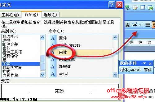 step02WORD2003界面上出现“我的字体”,在“自定义”对话框中切换到“命令”,在“类别”中选中“字体”,右侧“命令”栏中显示所有的字体列表,选中自己常用的字体,按住鼠标左健不放,将其拖到创建的“我的字体”工具栏上。
