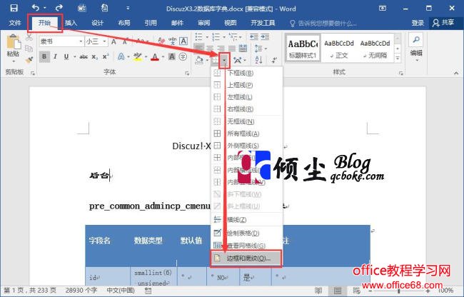 1.打开需要编辑的Word文档,在“开始”选项卡中点击“边框”按钮右侧的倒三角,在弹出的下拉菜单中选择“边框和底纹”选项。如下图
