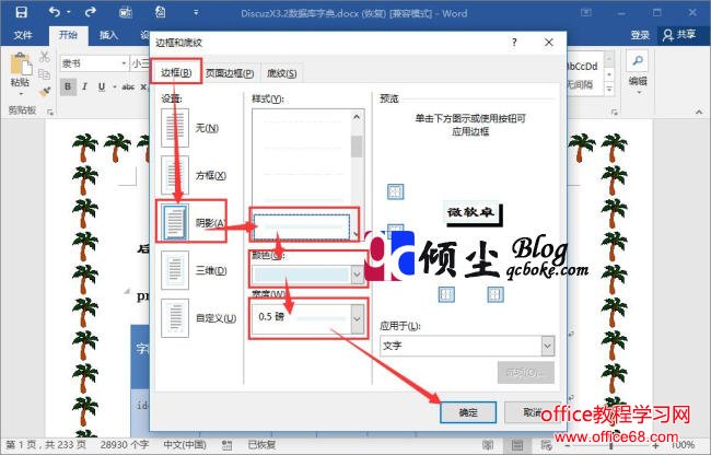 2.在弹出的“边框和底纹”对话框中选择“边框”选项卡,【设置:阴影,样式,颜色,宽度根据自己需求选择】完成之后点击“确定”完成操作。如下图