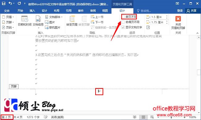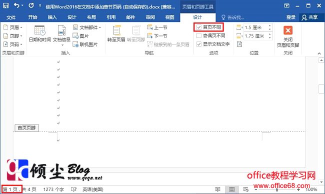 4、此时跳出如下界面,勾选【设计】选项卡中的【首页不同】。即可实现首页不显示页码的设置。