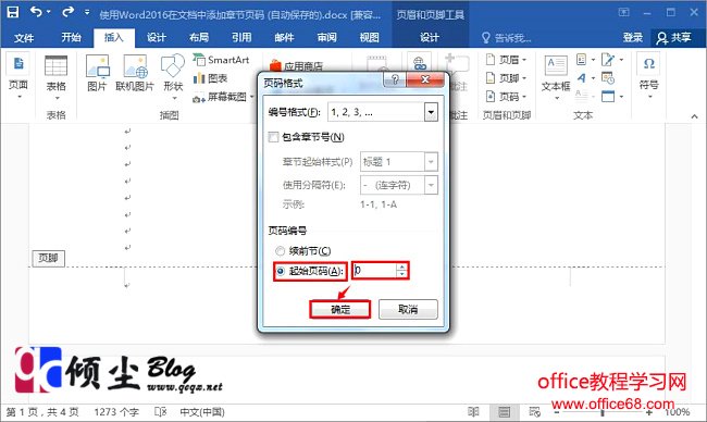 2、点选【起始页码】将后面的数值改为0。点击【确定】。