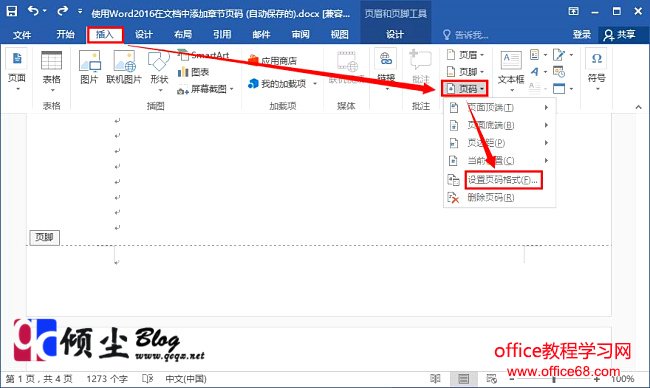 1、单击【插入】选项卡,点击【页眉和页脚】组中的【页码】,点击【设置页码格式】,弹出【页码格式】对话框。