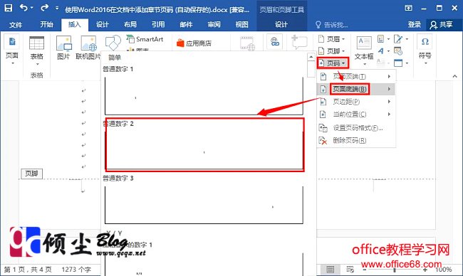 3、点击【页码】下拉菜单中的【页面底端】,选择需要的页码显示方式,我们选择【普通数字2】。