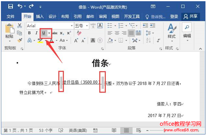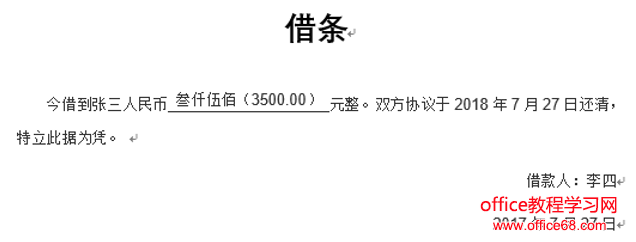 ![]() 提示:这里也可全选空格及金额区域内容,然后单击两次“下滑线”按钮或按两次Ctrl+U组合键同样可调整下划线距离。
