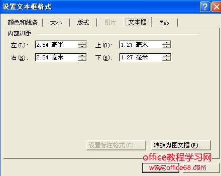 5、选中文本框,执行“格式→文本框”命令,打开“设置文本框格式”对话框(如图2),在“文本框”标签中按“转换为图文框”按钮(此步关键),在随后弹出的对话框中直接按“确定”按钮。