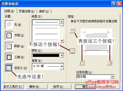 6、再次选中文本框(此时应该是图文框了),执行“格式→边框和底纹”命令,打开“边框和底纹”对话框(如图3),在“边框”标签中,先选中“设置”下面的“自定义”选项,再按预览区域中的三个边框设置按钮各一次(只保留一个不按,如图3),“确定”退出。