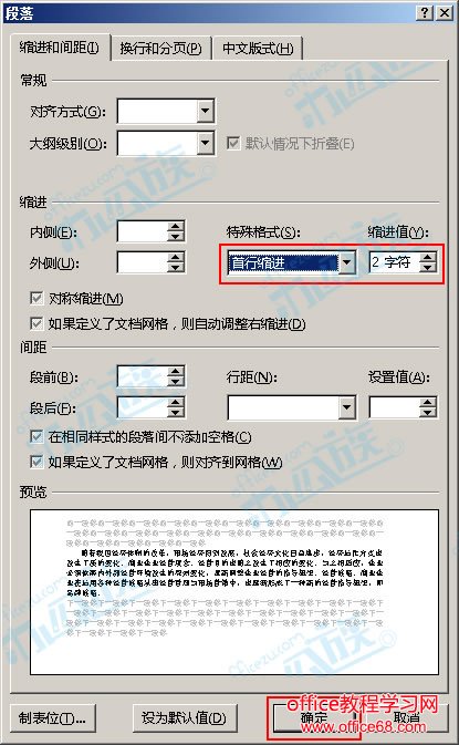 2 此时会弹出“段落”对话框,我们在“特殊格式”下拉框中选择“首行缩进”,然后可以根据需要修改缩进值,最后单击“确定”按钮。