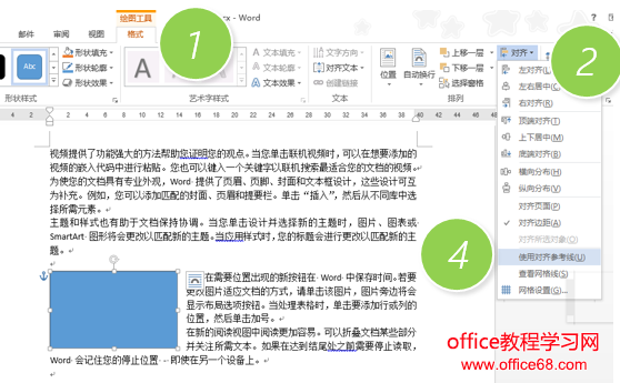 具体操作如下: 选中图形,在“绘图工具”格式中,找到“对齐”按钮,在菜单中找到“使用对齐参考线”,前面打勾即搞定。如下图4处。