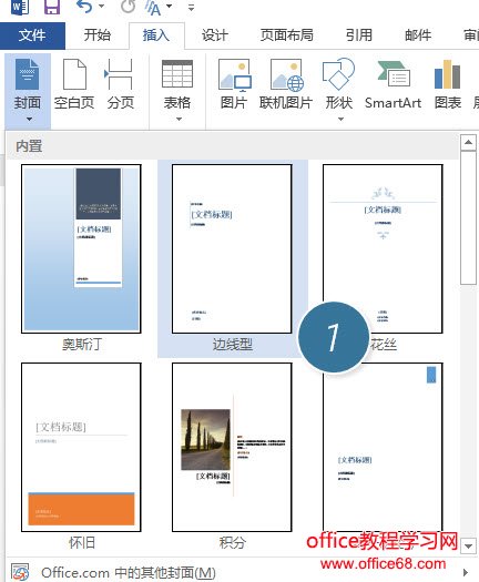 点击”插入-封面”,选择人气颇高的“边线型”封面。(下图1处)