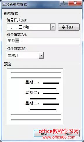 ![]() (2)打开“定义新编号格式”对话框,在编号格式中输入“星期”,在“编号样式”下拉列表中选择编号的数字格式,这里选择“一,二,三(简)”。“对齐方式”选择“左对齐”,然后点击“确定”按钮。
