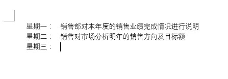 ![]() (3)返回工作界面,文档中将自动输入星期一。这时你再输入相应的行程安排。然后按【Enter】键即会自动生成星期二、星期二.......,以此类推......