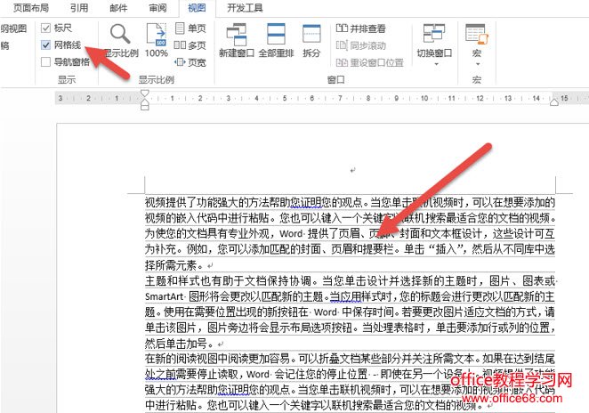 需要补充的是,如果在“视图—网格线”中勾选网格线(下图箭头处),这种网格线是不会打印到纸张上的。