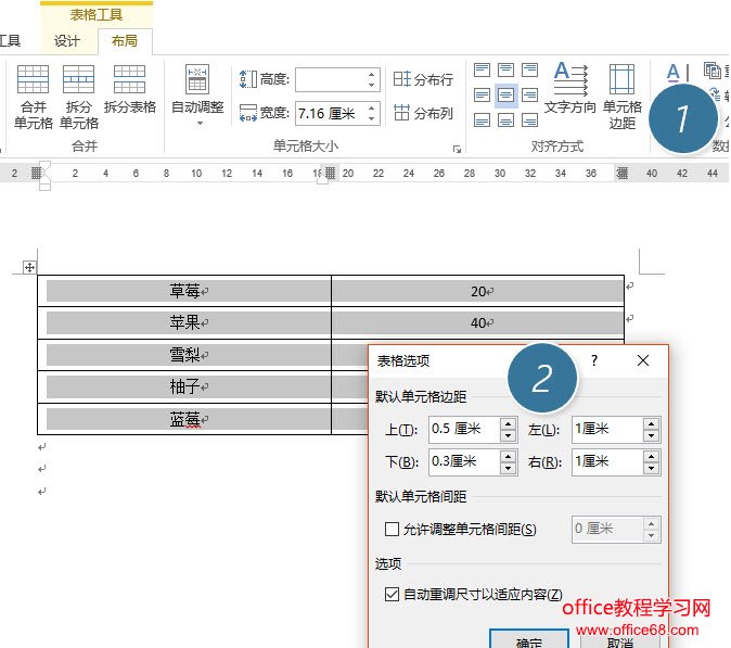 选中表格,然后点击“布局—对齐方式—单元格边距”(下图1处)输入需要对齐的参数(下图2处)