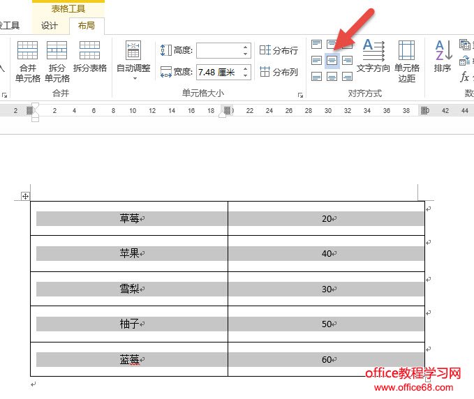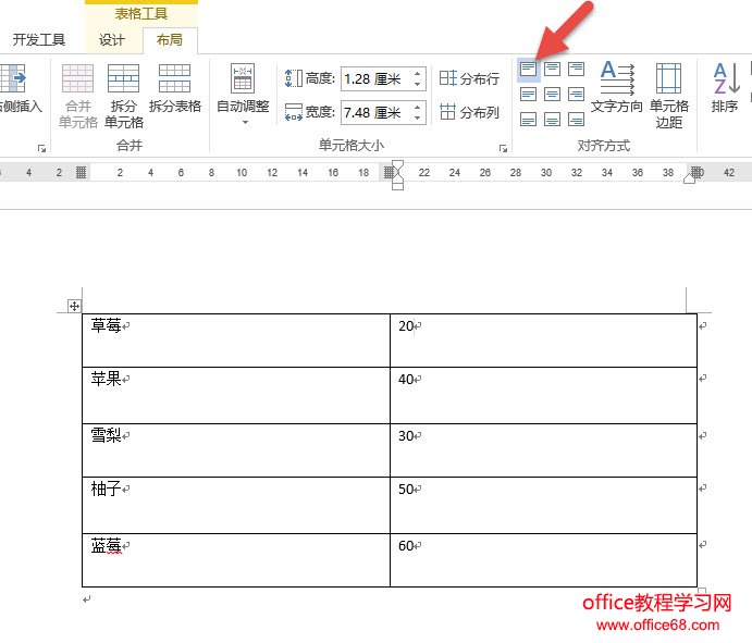 在Word中产生一张表格,你会发现默认单元格内的内容都是左上角对齐的位置,原因很简单,就是表格的对齐方式默认是左上角。(下图箭头处)