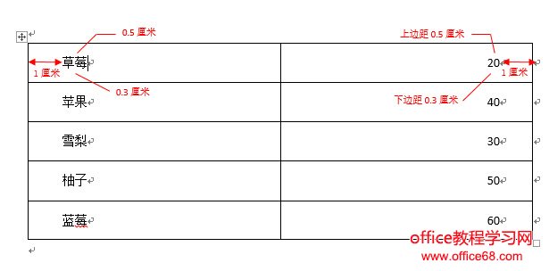 大家都知道在表格中,汉字和字母应该左对齐,而数字是右对齐的。如果对表格内的内容进行精准的定位,比如下图中单元格内的上边距设置为0.5厘米,下边距是0.3厘米,左右对齐1厘米。这需要用到下面的技能。