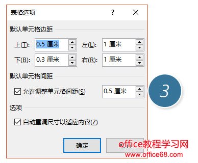 这里补充一下,如果在单元格边距中设置如下参数,允许调整单元格间距,设置为0.5厘米。下图3处。