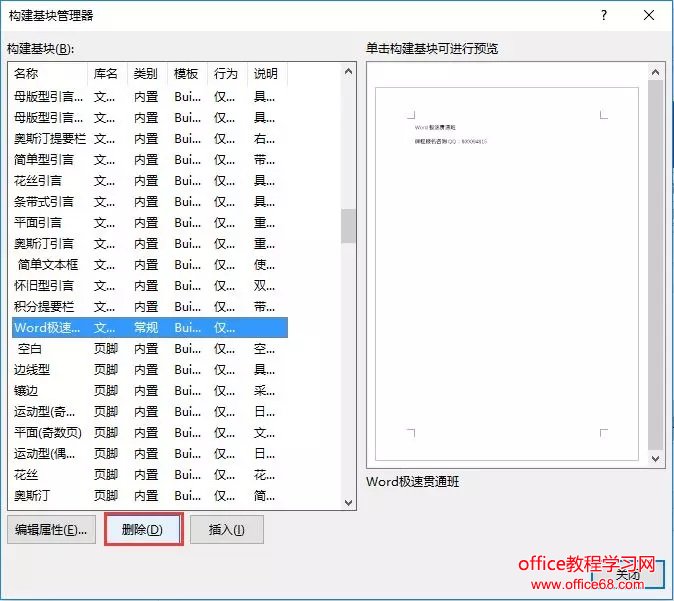 方法:单击【插入】-【文本】-【文档部件】-【构建基块管理器】,打开”构建基块管理器“对话框,选中需要删除的对象,点击”删除“按钮即可。