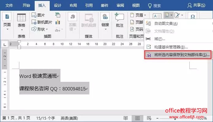 (1)选择所需要的文本或图片,单击【插入】-【文本】-【文档部件】-【将所选内容保存到自动图文集库】。