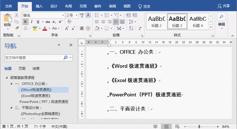 如果要将文档的标题段落用样式快速设置其格式,可先选中文本,然后单击【开始】-【样式】组中的样式运用即可。