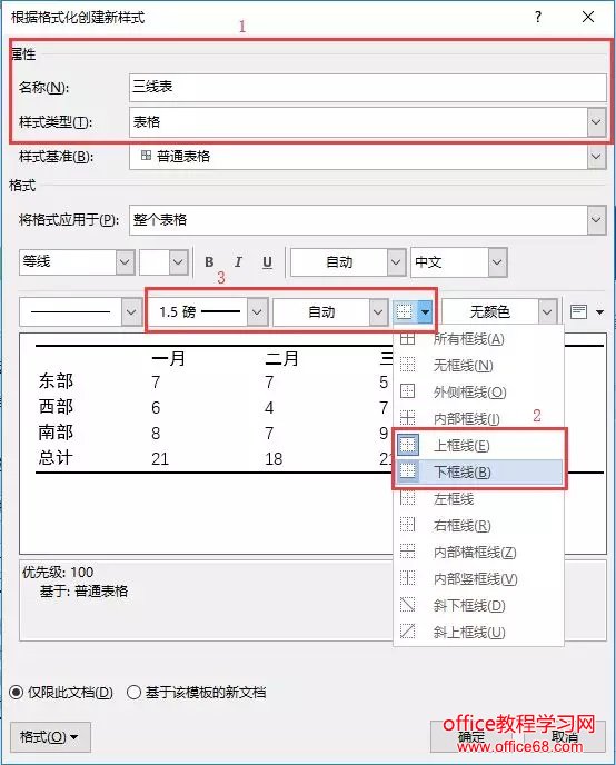 (2)置【名称】为【三线表】,点击”框线设置“按钮,在弹出的下拉菜单中分别选择【上框线】和【下框线】,然后分别设置【线宽】为【1.5磅】。
