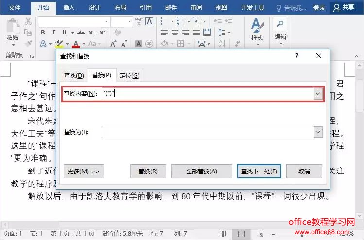 (1)在文档中按【Ctrl+F】组合键,打开“查找和替换”对话框,在“查找内容”中输入"(*)"。