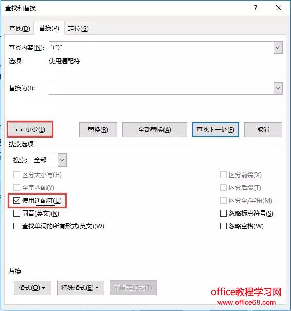 ![]() (2)点击“更多”按钮,展开搜索选项,勾选“使用通配符”复选框。