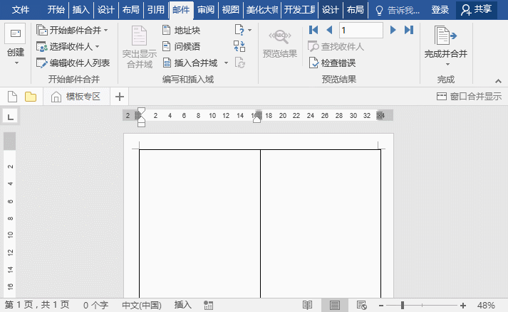 (1)制作会议牌模板。打开Word,选择【布局】-【页边距】-【窄】选项。然后选择【插入】-【表格】,插入一个1行2列的表格,然后调整其大小铺满整个页面,并保存文档,如图所示。