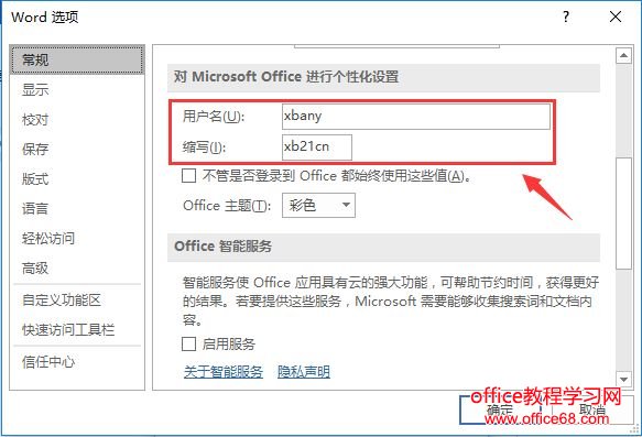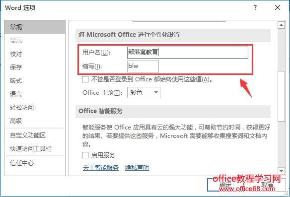 (3)打开“Word选项”对话框,选择“常规”选项卡,在“对 Office 副本进行个性化设置”栏下,更改您要在自己的批注中使用的姓名或缩写。