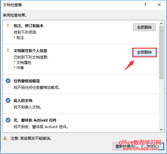 (3)此时,即开始对文档进行检查。检查完毕后,单击”文档属性和个人信息“右侧的”全部删除”按钮。