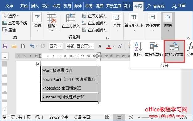 (4)选中左侧保留的表格,点击【布局】-【数据】-【转换为文本】按钮,在打开的对话框中直接单击“确定”按钮。
