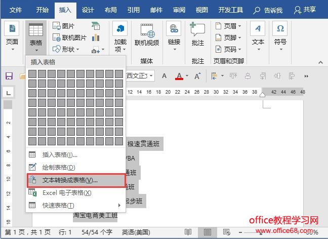 (1)选中文本,点击【插入】-【表格】按钮,在弹出的菜单中选择“文本转换为表格”命令。