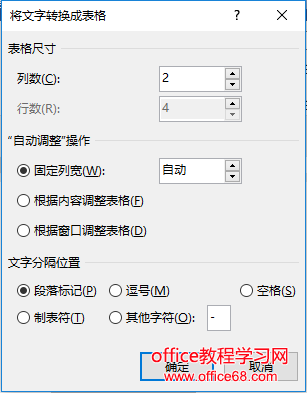 (2)打开“将文字转换成表格“对话框,在”列数“数值框中输入2,将其设置为2列,然后单击”确定“按钮。