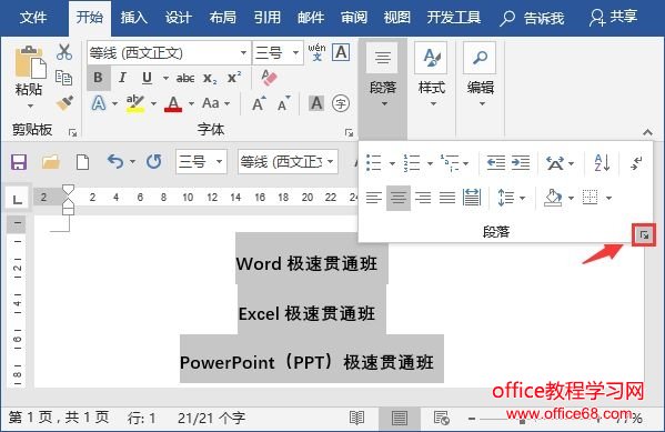 (1)选择所有的标题文本,点击【开始】-【段落】组右下角的扩展按钮。