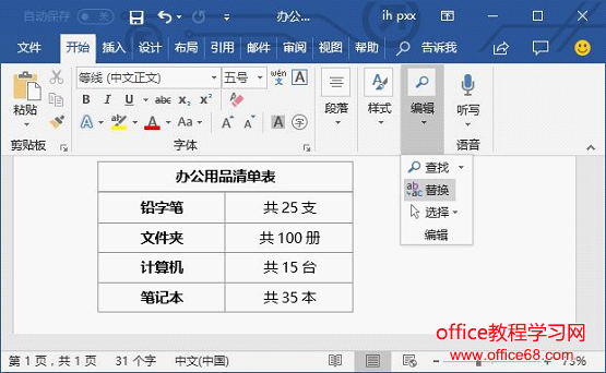 第一步:首先将内容复制到Word文档,点击【开始】-【编辑】-【替换】按钮,或按【Ctrl+H】打开“查找和替换”对话框。
