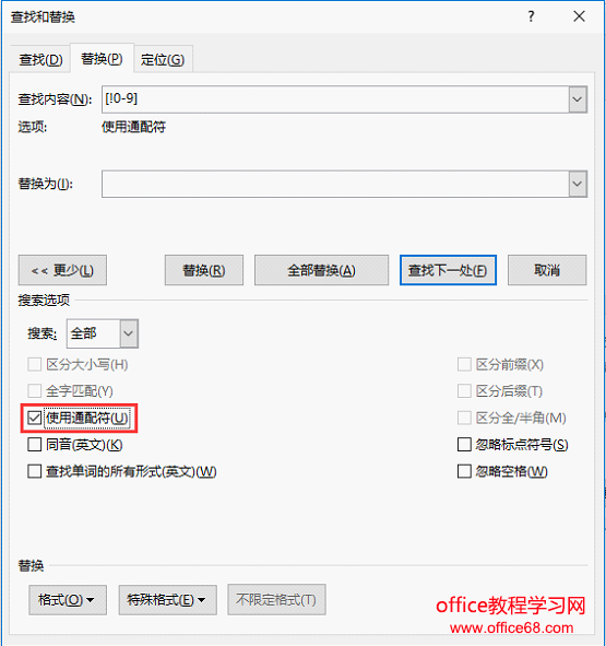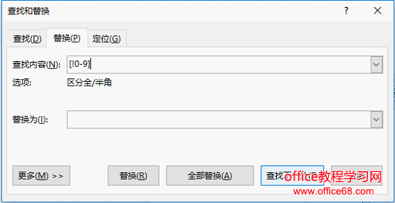 ![]() 第二步:在“查找内容”文本框中输入[!0-9],在替换为文本框中不要输入内容。