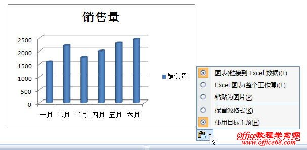 如果要插入的图表已经在Excel中制作完毕,可以直接在Excel中选中图表,然后复制粘贴到Word 2007中。这时,Word 2007中图表的右下角会出现一个粘贴选项按钮,如图: