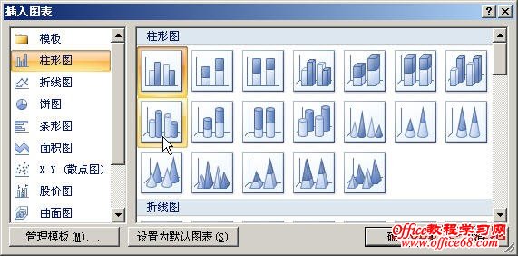 1.将光标定位到Word文档中的插入点,单击功能区选项卡“插入”,在“插图”组中单击“图表”,在弹出的“插入图表”窗口中选择一种图表类型,然后单击“确定”。